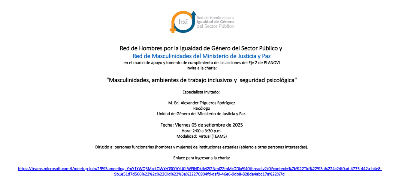 Red de Hombres por la Igualdad de Género del Sector Público y Red de Masculinidades del Ministerio de Justicia y Paz en el marco de apoyo y fomento de cumplimiento de las acciones del Eje 2 de PLANOVI