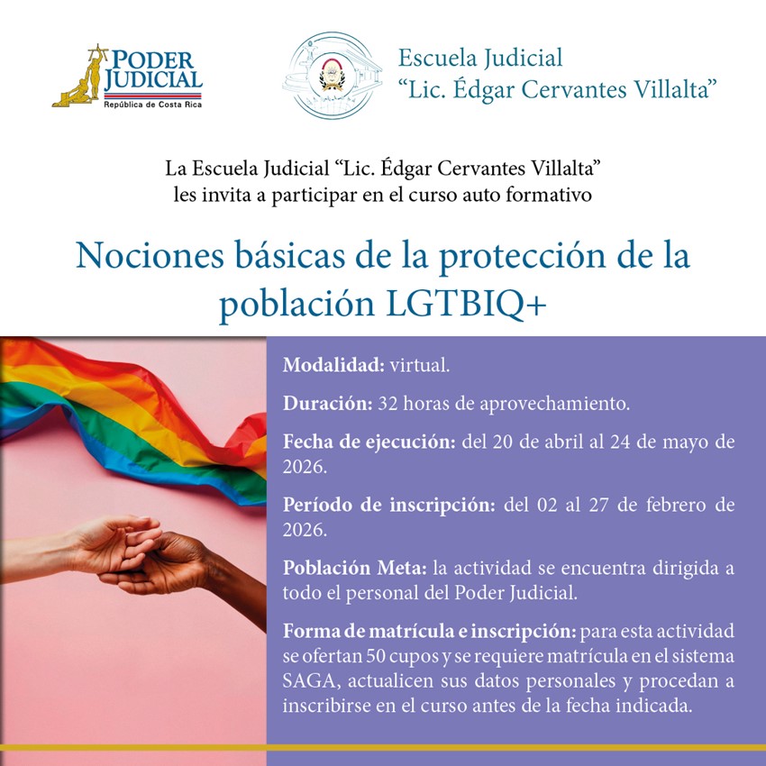 Competencia general: Aplicar los principios de igualdad y no discriminación, así como los estándares internacionales y nacionales de protección de los derechos de la población LGBTIQ+, incorporando conocimientos sobre diversidad sexual, identidad y expresión de género, la jurisprudencia relevante de la Corte Interamericana de Derechos Humanos y de la Sala Constitucional de Costa Rica, así como las políticas del Poder Judicial, para el pleno acceso a la justicia grarantizando un trato digno, inclusivo y respetuoso hacia esta población por parte de las personas funcionarias judiciales.