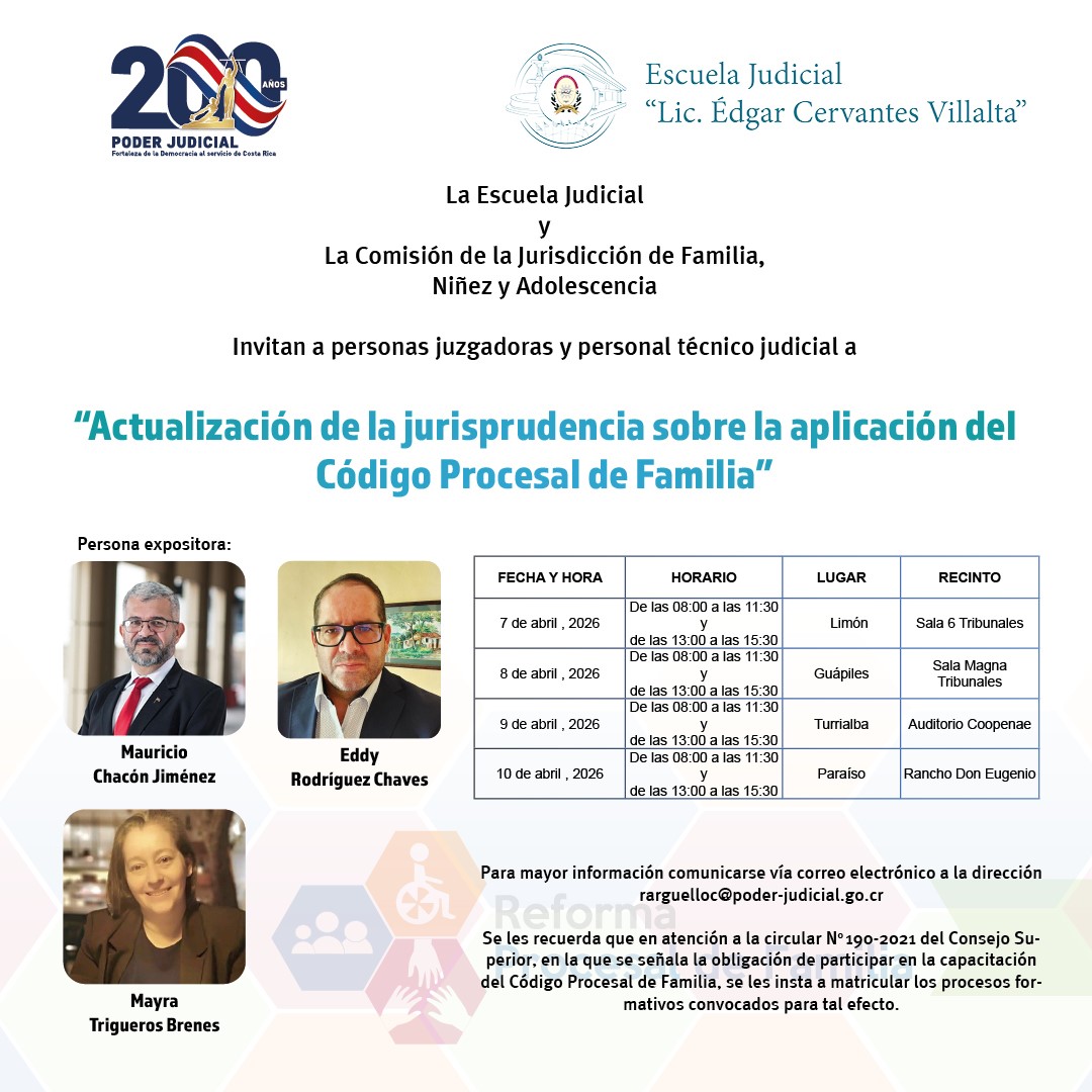 Invitan a personas juzgadoras y personal técnico judicial a “Actualización de la jurisprudencia sobre la aplicación del Código Procesal de Familia”