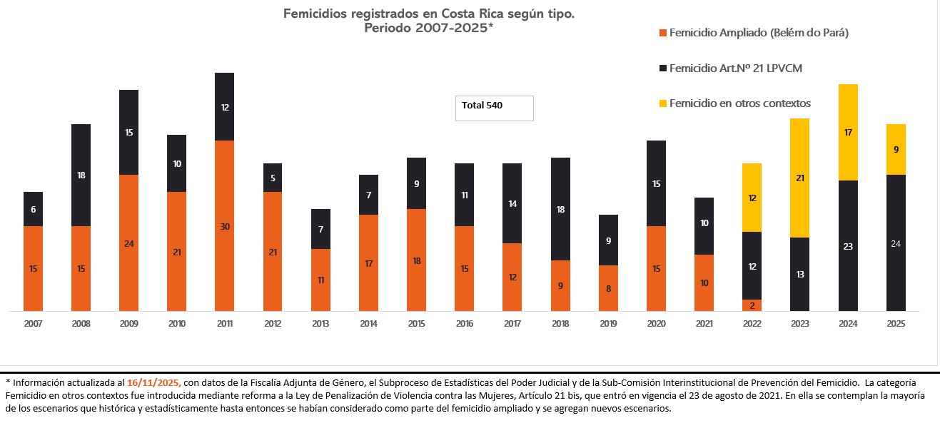 En Costa Rica, el femicidio está tipificado en la Ley de Penalización de la Violencia contra las Mujeres (LPVcM), promulgada en el año 2007 y con reformas importantes en el año 2021. El último informe oficial del Subproceso de Estadística de la Dirección de Planificación del Poder Judicial sobre femicidio responde al oficio N° 138-2024, y fue conocido por el Consejo Superior, en su sesión del 11 de enero de 2024. En este informe se analizan los datos y distintas variables de las muertes ocurridas durante el año 2022. Descargarlo AQUÍ.