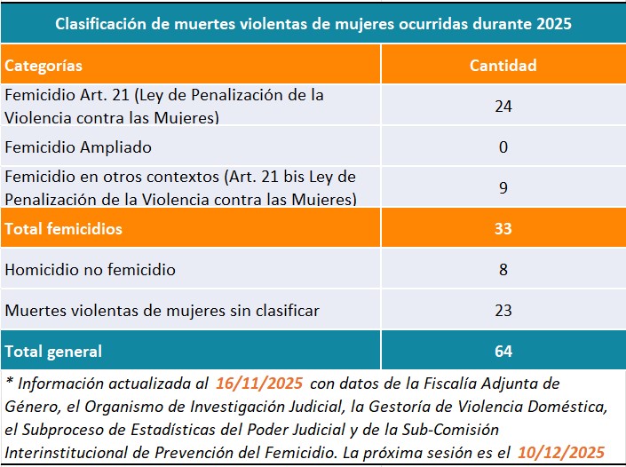 Los datos estadísticos contemplan tres tipos de femicidio. El primero es el femicidio, tipificado por el artículo 21 de la Ley de Penalización de Violencia contra las Mujeres (LPVcM), el cual, hasta el 9 de junio de 2021 sancionaba sólo las muertes de las mujeres a manos de sus cónyuges o parejas actuales, y por interpretación jurisprudencial, excepcionalmente se incluían algunos casos a manos de expareja. Por reforma a dicha ley, a partir del 10 de junio del mismo año, el mencionado artículo incluye los asesinatos de mujeres en los siguientes escenarios: las relaciones de noviazgo, convivencia, de no convivencia, casual u otra análoga, aun cuando medie divorcio, separación o ruptura, siempre que la conducta no constituya un delito más grave o previsto con una pena mayor.